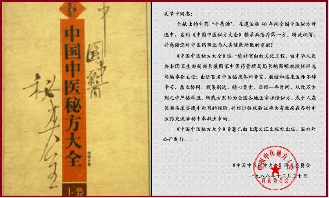 例五:香港刘风霞女士,全身患牛皮癣15年,历经美国,日本等多家医院治疗收效不佳,1988年她从《银屑病通报》看了吴梦平发表的论文后,求治3个疗程痊愈,随访10年未复发。