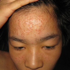 本病男性多于女性,16-40岁好发。皮损为毛囊性半球状红色丘疹,直径2-4mm,有光泽,周围可有红晕,多发于胸背、颈、肩、上臂、腰腹部,散在对称分布,数十至数百个,较密集但不融合,可间杂有小脓疱或黑头粉刺。